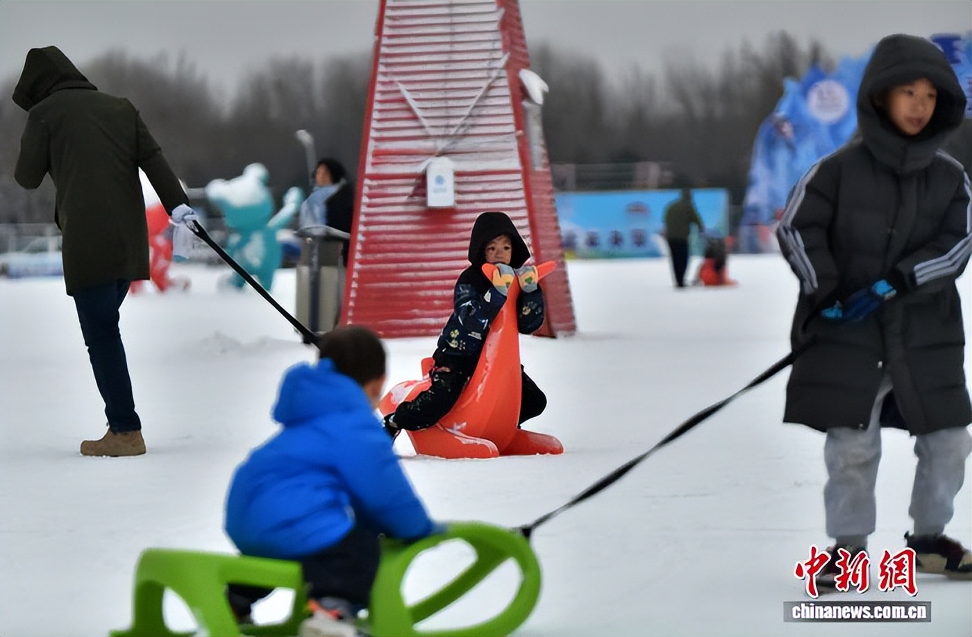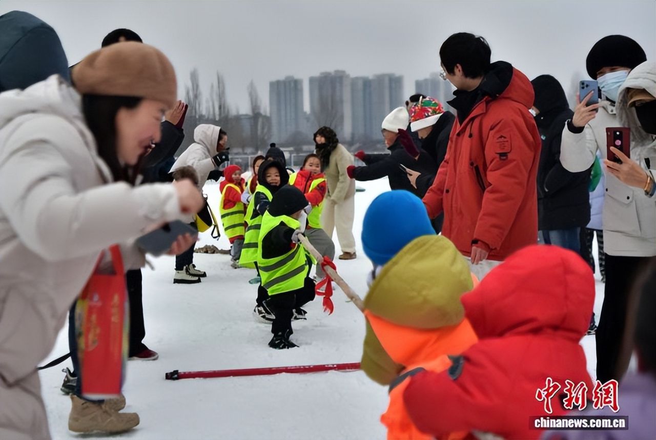1月18日,河北石家庄迎来降雪,小朋友在正定冰雪嘉年华玩拔河游戏,尽情享受冬日雪趣。中新社记者 翟羽佳 摄