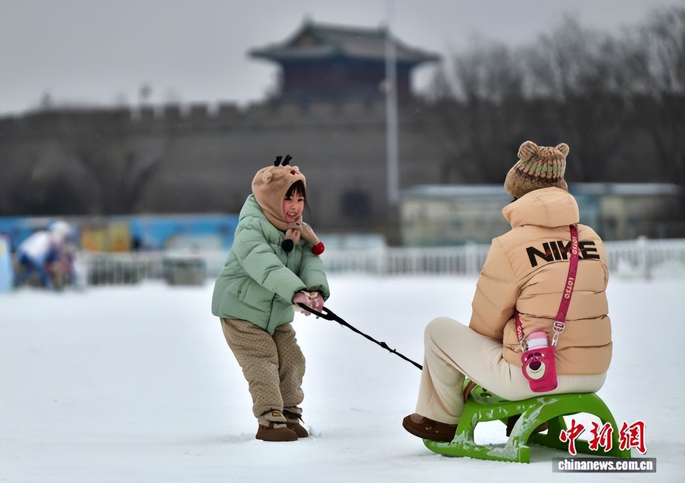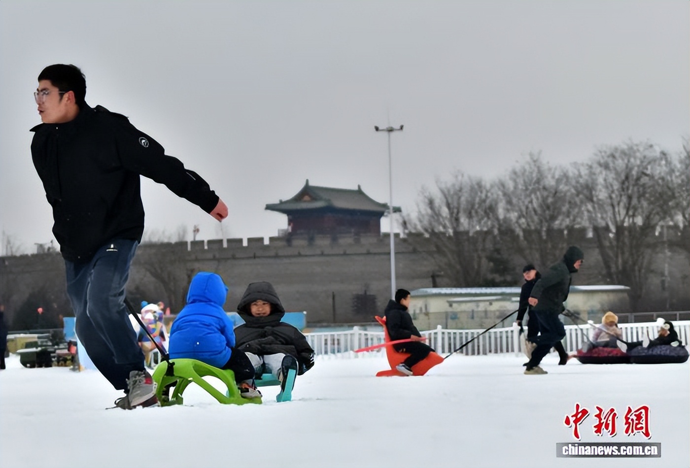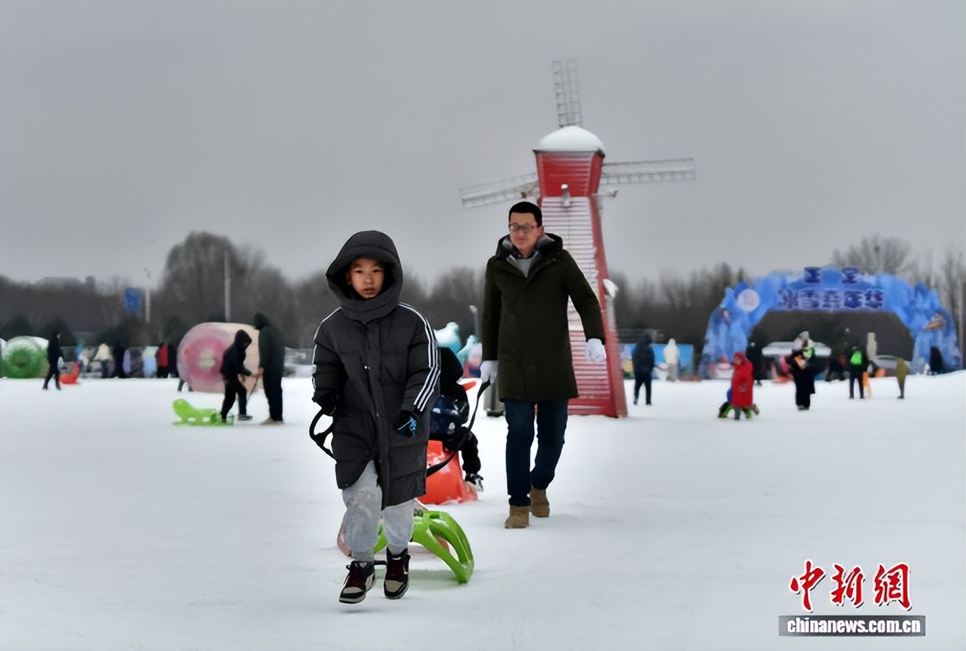 1月18日,河北石家庄迎来降雪,东北小伙儿带着儿子在正定冰雪嘉年华游玩,尽情享受冬日雪趣。中新社记者 翟羽佳 摄
